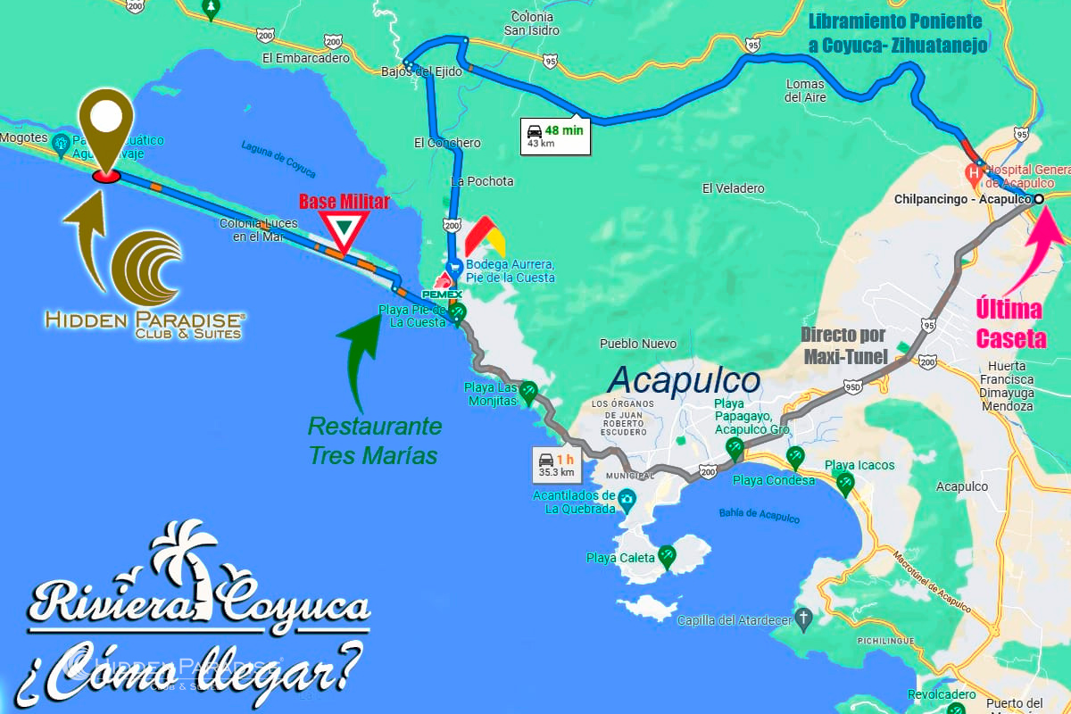 Para los nostálgicos de las multitudes o los amantes de la diversión y bullicio de plazas, bares y antros, nuestro «Paraíso Escondido» se encuentra a la justa distancia entre lo lejano y lo cercano, por lo que gracias a la nueva carretera panorámica de cuatro carriles terminada en 2015 (Mozimba – Pie de la Cuesta), nuestros socios podrán llegar desde el desarrollo hasta la costera en solo 25 minutos. (19km aprox.)