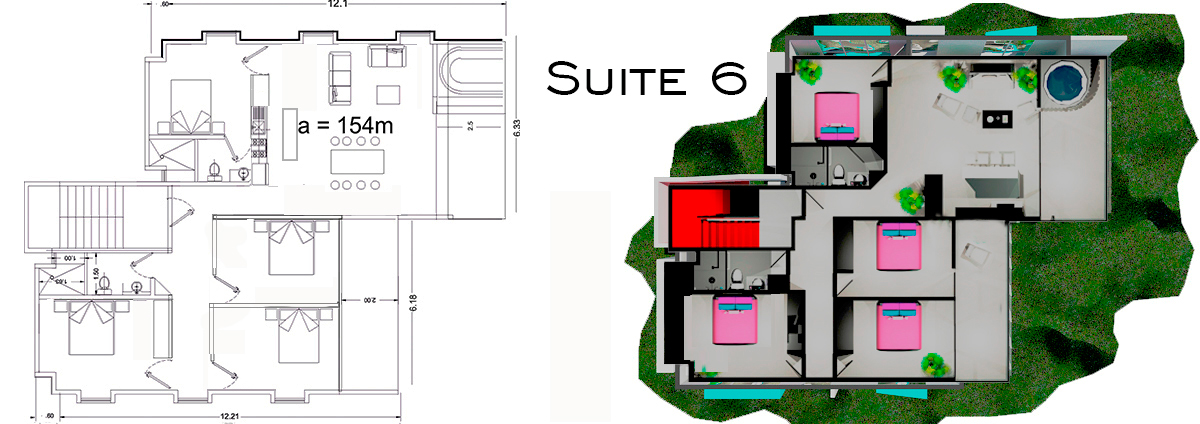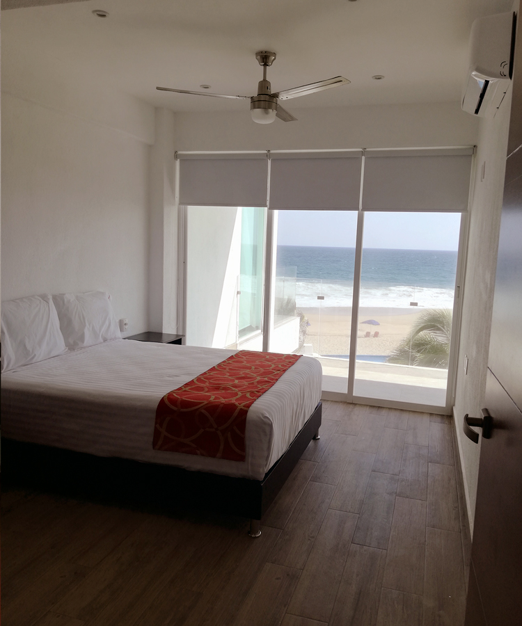 Esta increíble suite en el segundo piso es perfecta para quien está acostumbrado a los grandes espacios y busca siempre obtener el máximo lujo y confort para su familia o amigos. La MASTER SUITE 6 de 154m2 es nuestra suite más lujosa. Tiene 4 recámaras con camas Queen Size, 2 baños completos y un mayor espacio de terraza con Jacuzzi, y una amplia área de «Living» (sala y comedor).